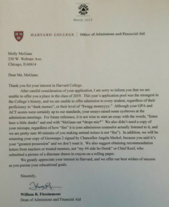 Harvard rejection letter meme. The 18 year old has actually applied to harvard and is slightly concerned the tongue in cheek letter may harm her admissions odds. On 4 march 2015 a purported harvard student admissions rejection letter was circulated via social media sites including the following tweet which achieved heavy circulation. The memes were posted in a facebook group message called harvard memes for horny bourgeois teens and general fuckups. Sharing fake rejection letters has long been a rite of passage for high school seniors a means of catharsis during the most stressful time of. The letter which has the name of admissions dean william r. School officials told the boston globe they have indeed seen mcgaan s handiwork but declined to comment further. The 18 year old who really applied to harvard thought the joke was obvious enough.