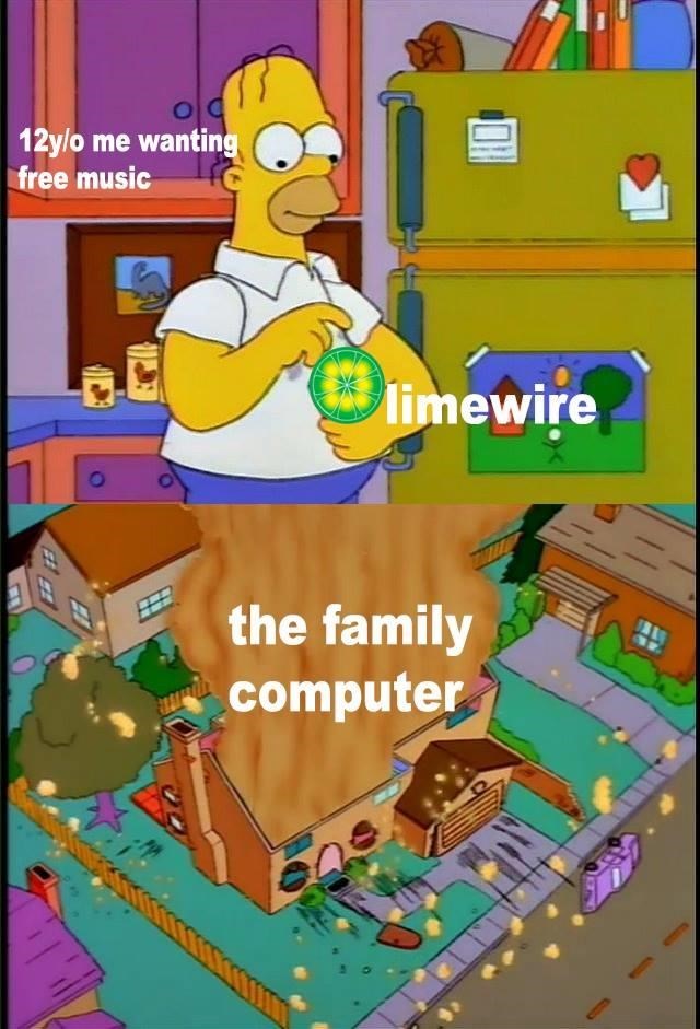 On october 16th 2018 emilybrewerr a member of the facebook meme sharing group simpsons shitposting posted an object labeling image macro that expresses the experience of using limewire as a child.