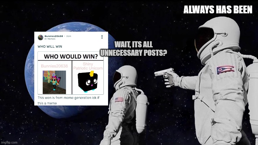 Wait it s just always has been meme. Always has been a meme that looks strangely familiar like from a movie. Wait it s all ohio. An element of a. Always has been refers to an exploitable template in which two astronauts are in space. Make wait it s all. Exploitable year 2018 origin 4chan tags astronauts ohio vs. Puberty memes alwayshasbeen waititsall.